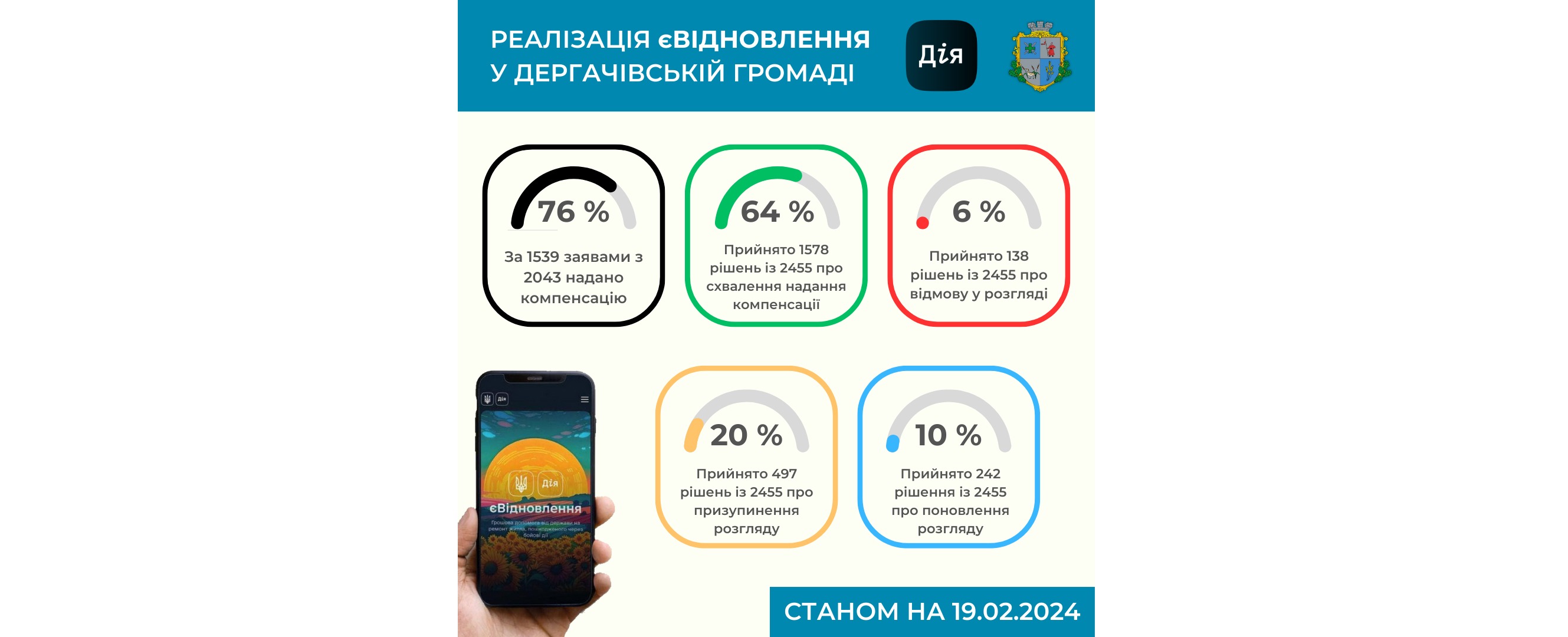 Станом на 19.02.2024 р. мешканці громади отримали грошову компенсацію за 1539 заявами у розмірі 194 059 599 грн.