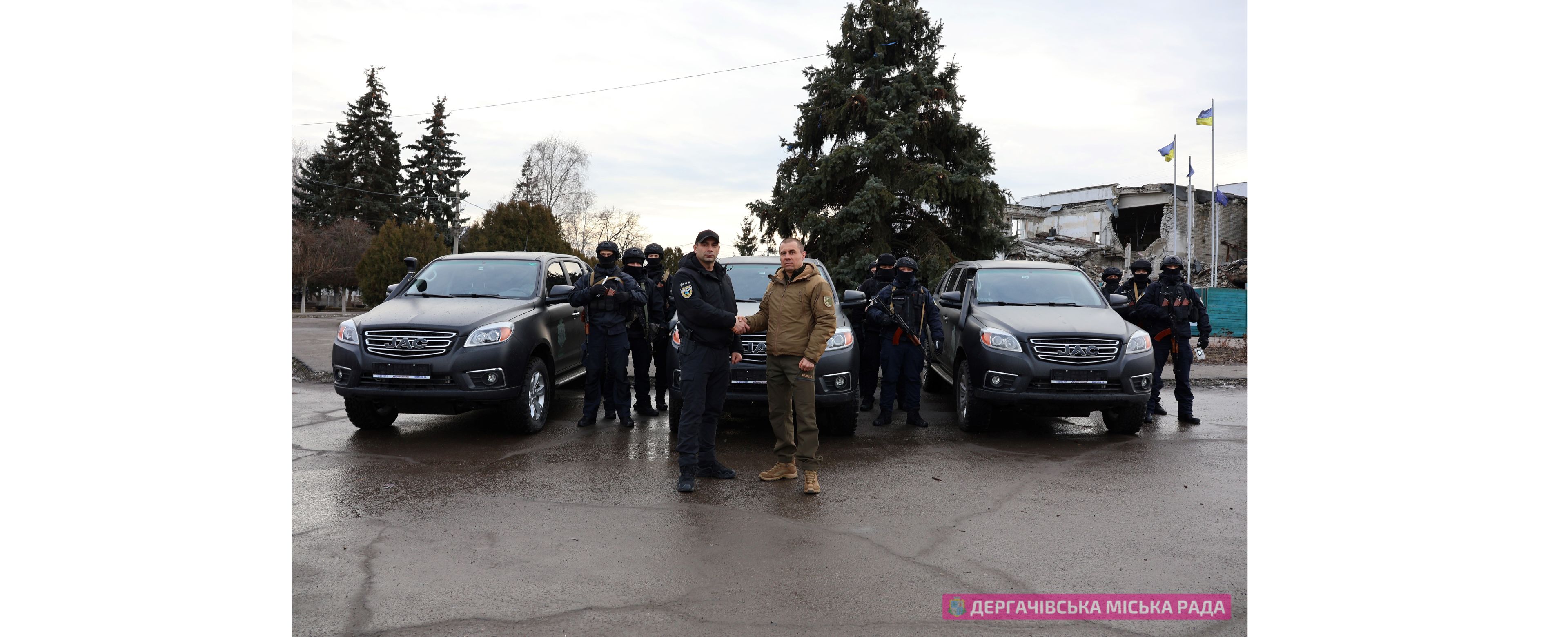 У межах програми протидії дронам-камікадзе Дергачівська МВА передала 3 повнопривідні пікапи JAC полку поліції особливого призначення ГУНП в Харківській області