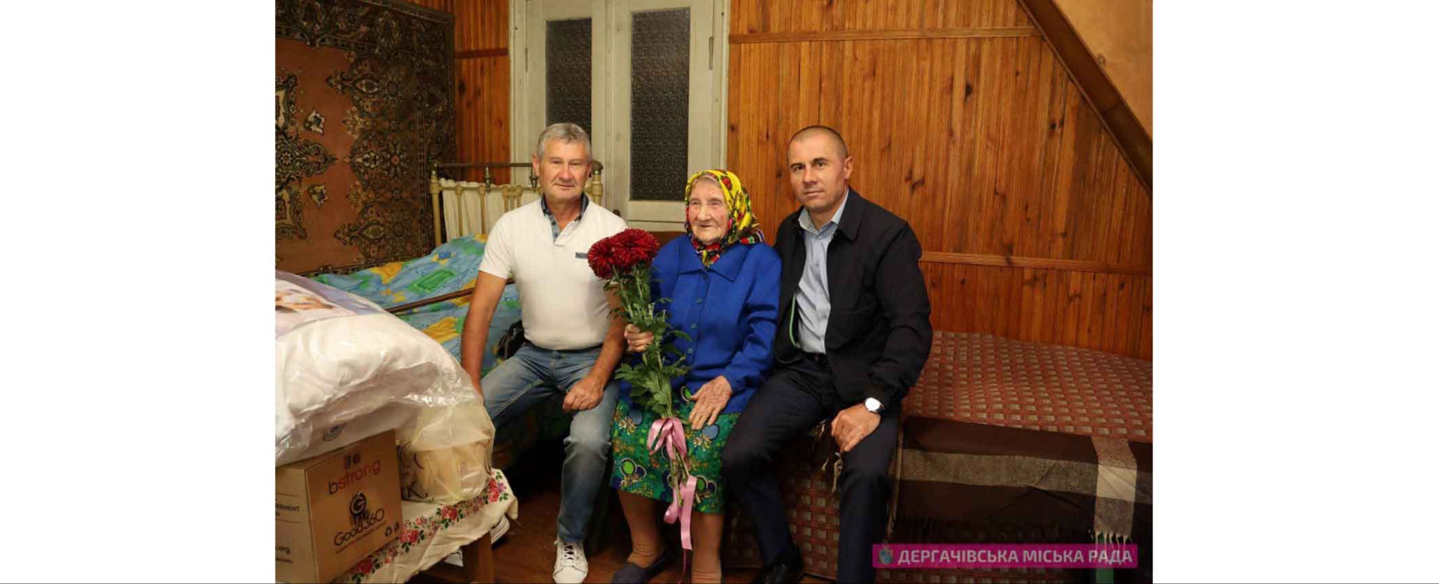 У цей святковий день начальник Дергачівської МВА Вячеслав Задоренко разом з головою Дергачівської організації ветеранів України Сергієм Остапенком зі щирими привітаннями та подарунками завітали до іменинниці.
